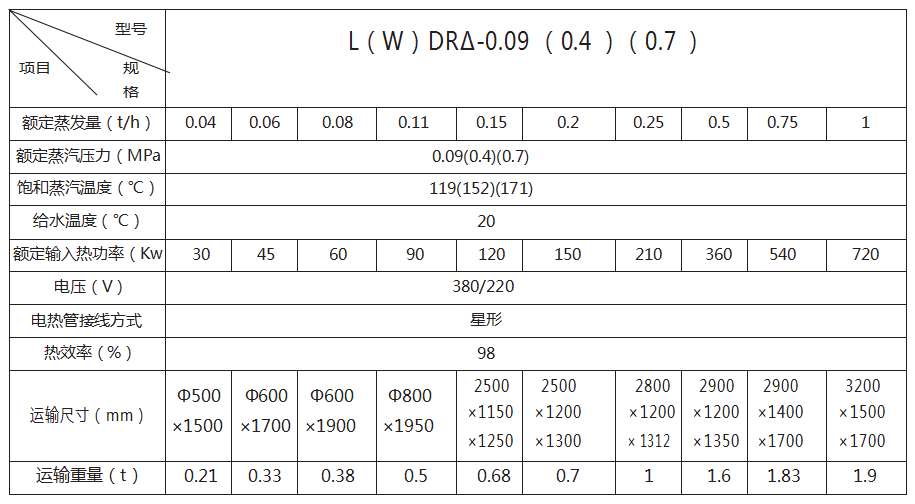 L( W) DRΔ-0.09(0.4)(0.7)全自动电加热蒸汽锅炉结构采 用立式或卧式结构,布置多组电热 管。电热管采用不锈钢管,内填氧化 镁以绝缘传热,电阻丝采用优质镍铬 合金材料,传热效果好,使用寿命 长。升温、升压快,工作压力可在额 定工作压力内调节,任意设定,满足 不同用户的需要。全自动微电脑控 制,采用模糊控制算法,操作简便, 工作可靠,并且有手动、自动转换功 能,真正实现无人操作。采用梯式加 载模式,分别启动加热元件,避免对电器和电网造成冲击。电热元件具有循环投切功能,使各接触器及电加热元件使用时间及动作 频率相同,从而提高各电器元件使用寿命。电热锅炉运行时,可充分利用峰谷电价差,实行蓄 热运行,这样既可大幅降低运行成本,同时削峰填谷的工作方式也有利于整个电网的平衡稳 定。该电锅炉结构紧凑、体积小、外型美观、无污染、低噪音、安装周期短,投用迅速,采用 纯电阻加热控制,可靠的保温绝热层,热效率高达98%。电控箱采用集中控制,操作使用简 便,自动化程度高,水位自动调节控制,具有超压、短路、缺水、缺相、漏电等多种报警保护 功能,安全可靠。该产品所配元、器件均可拆卸、更换,检修、清洗极为方便.