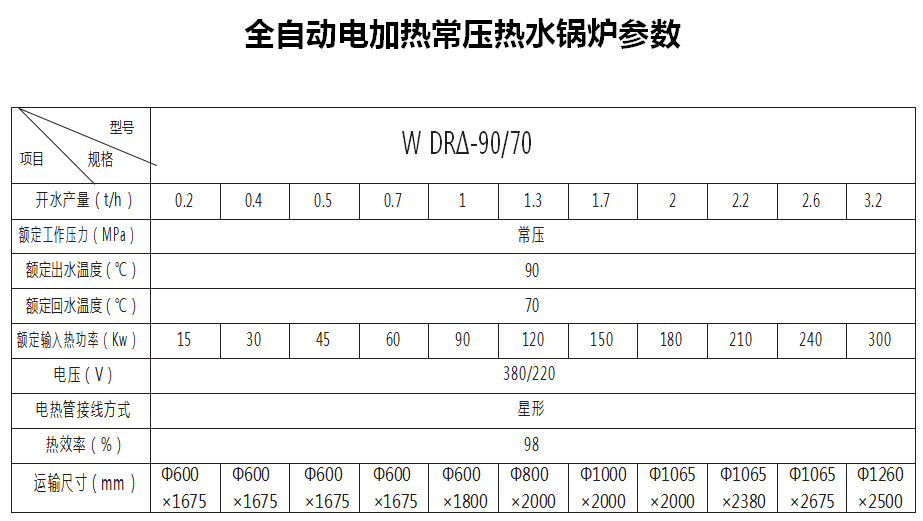 WDRΔ-90/70全自动电加热常压热水锅炉布置多组电热管。电热管采用不锈钢管,内填氧 化镁以绝缘传热,电阻丝采用优质镍铬合金材 料,传热效果好,使用寿命长。升温、升压