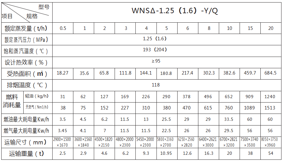 WNSΔ-1.25(1.6)-Y/Q型全自动燃油(气)蒸汽锅炉系卧式内燃锅壳式蒸 汽锅炉。该锅炉由锅炉本体、烟囱、燃烧 机、自控系统等部件组成。炉前根据用户 使用不同的燃料装有燃油或燃气的燃烧 机,燃油(气)是在炉胆前部的火道中着 火燃烧,燃烧后的高温烟气由炉胆向后流 动,经烟室上部进入第一管束区。然后经 前烟箱折返进入第二管束区再经后烟箱、 最后从烟囱排出。该型锅炉的运行采用全 自动控制,以提高锅炉运行的可靠性。控 制系统主要包括:程序启停、燃烧自动调 节、水位控制、超压保护、等自动报警和 停炉保护系统。以保证锅炉安全和经济运 行。锅炉设计符合GB13271-2014《锅炉 大气污染物排放标准》,TSG G0002- 2012《锅炉节能技术监督管理规程》。